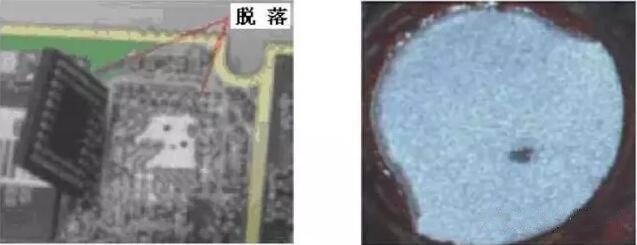 這種焊點(diǎn),釬料是黏附在焊盤表面上的,有時(shí)表現(xiàn)得毫無連接強(qiáng)度可言。圖為一塊PCBA上的CSP芯片,由于冷焊,一受力芯片便撕裂下來。器件與焊盤分離后,焊盤表面潔凈且呈金屬光澤,如右圖所示。它與分離后的虛焊點(diǎn)的焊盤表面是完全不同的。
