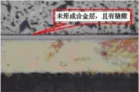 冷焊發(fā)生的原因主要是焊接時(shí)熱量供給不足,焊接溫度未達(dá)到釬料的潤濕溫度,因而結(jié)合界面上沒有形成IMC或IMC過薄,如左圖所示。有的情況下,界面上還存在著裂縫,如圖所示。