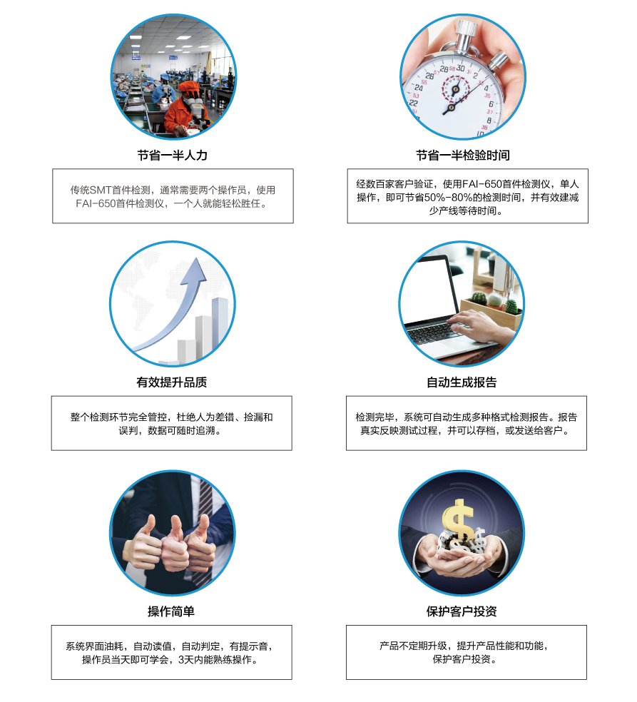 當(dāng)今SMT電子工廠,多機種、小批量、換線頻,使得首件檢測的任務(wù)越發(fā)繁重。傳統(tǒng)的SMT首件檢測方法,不僅浪費人力,效率低下,整個首件檢測過程缺乏管控,品質(zhì)難以得到保證。針對此難題,深圳市藍眼科技有限公司首創(chuàng)了SMT首件檢測儀,通過不斷升級優(yōu)化,現(xiàn)已研發(fā)出第四代首件檢測儀FAI-650,具有以下顯著優(yōu)勢: