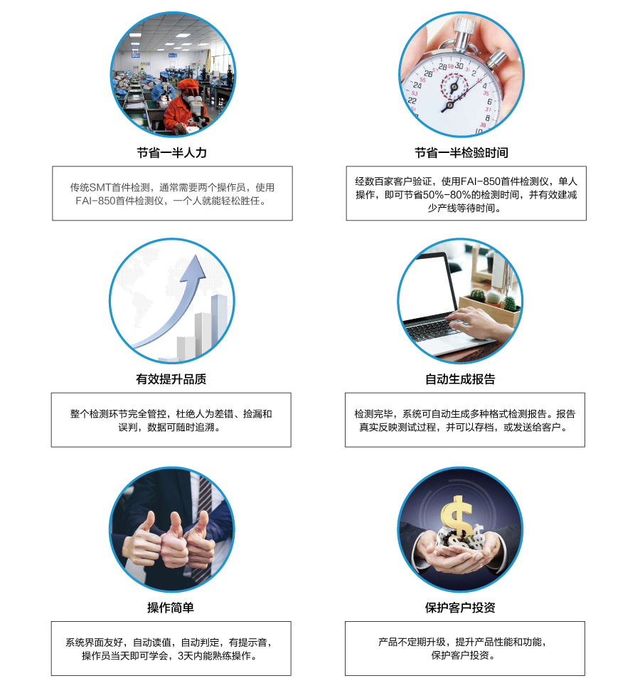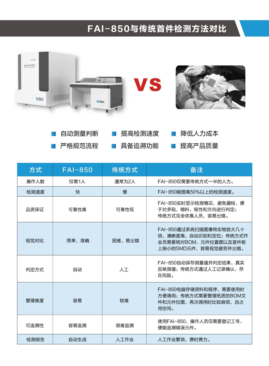 當(dāng)今SMT電子工廠,多機(jī)種、小批量、換線頻,使得首件檢測(cè)的任務(wù)越發(fā)繁重。傳統(tǒng)的SMT首件檢測(cè)方法,不僅浪費(fèi)人力,效率低下,整個(gè)首件檢測(cè)過程缺乏管控,品質(zhì)難以得到保證。針對(duì)此難題,深圳市藍(lán)眼科技有限公司首創(chuàng)了SMT首件檢測(cè)儀,通過不斷升級(jí)優(yōu)化,現(xiàn)已研發(fā)出第四代首件檢測(cè)儀FAI-850,具有以下顯著優(yōu)勢(shì):